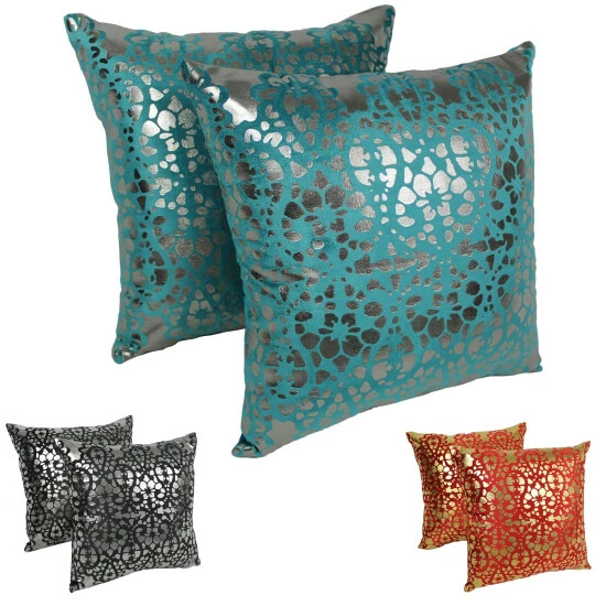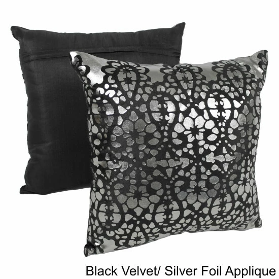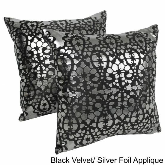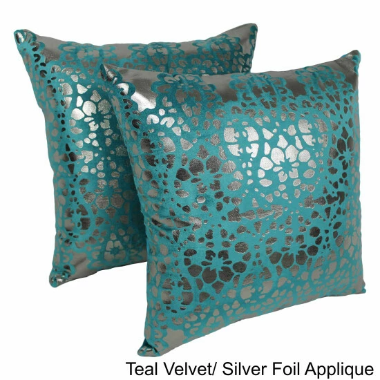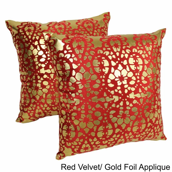 Add a splash of colorful style and plush comfort to your home décor with these throw pillows. These throw pillows features a striking velvet and foil applique construction in your choice of three colors. Includes removable inserts for easy cleaning.