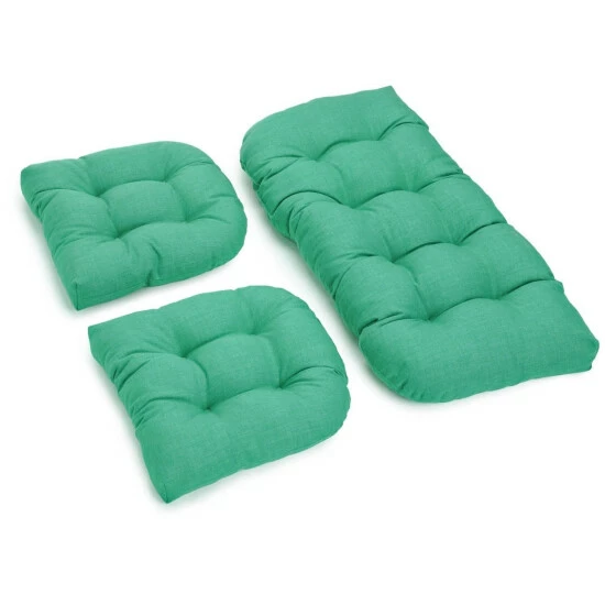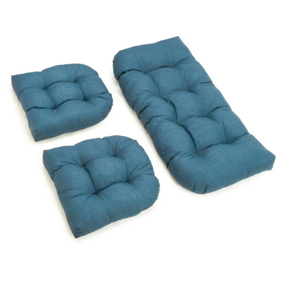 Complete your new patio set or replace old cushions with this three-piece cushion set from Blazing Needles. This set includes two chair cushions and one loveseat cushion, all made of weather-resistant, non-fading spun polyester fabric with crushed polyester fill. Choose from a variety of solid colors to best pair with your patio furniture.
